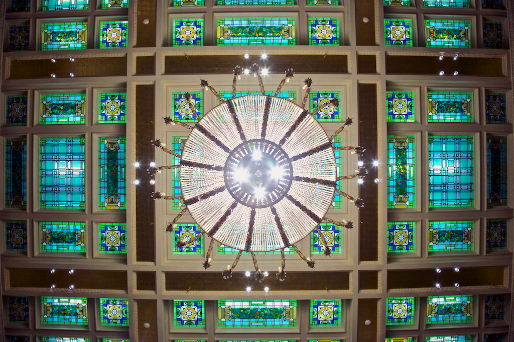 In our recent visit to Salt Lake, we stopped in the Joseph Smith builiding, the former location of Hotel Utah. It is a beautiful building, with many interesting details. Even the ceiling is beautiful as seen in this image of a chandelier descending below the stained glass.