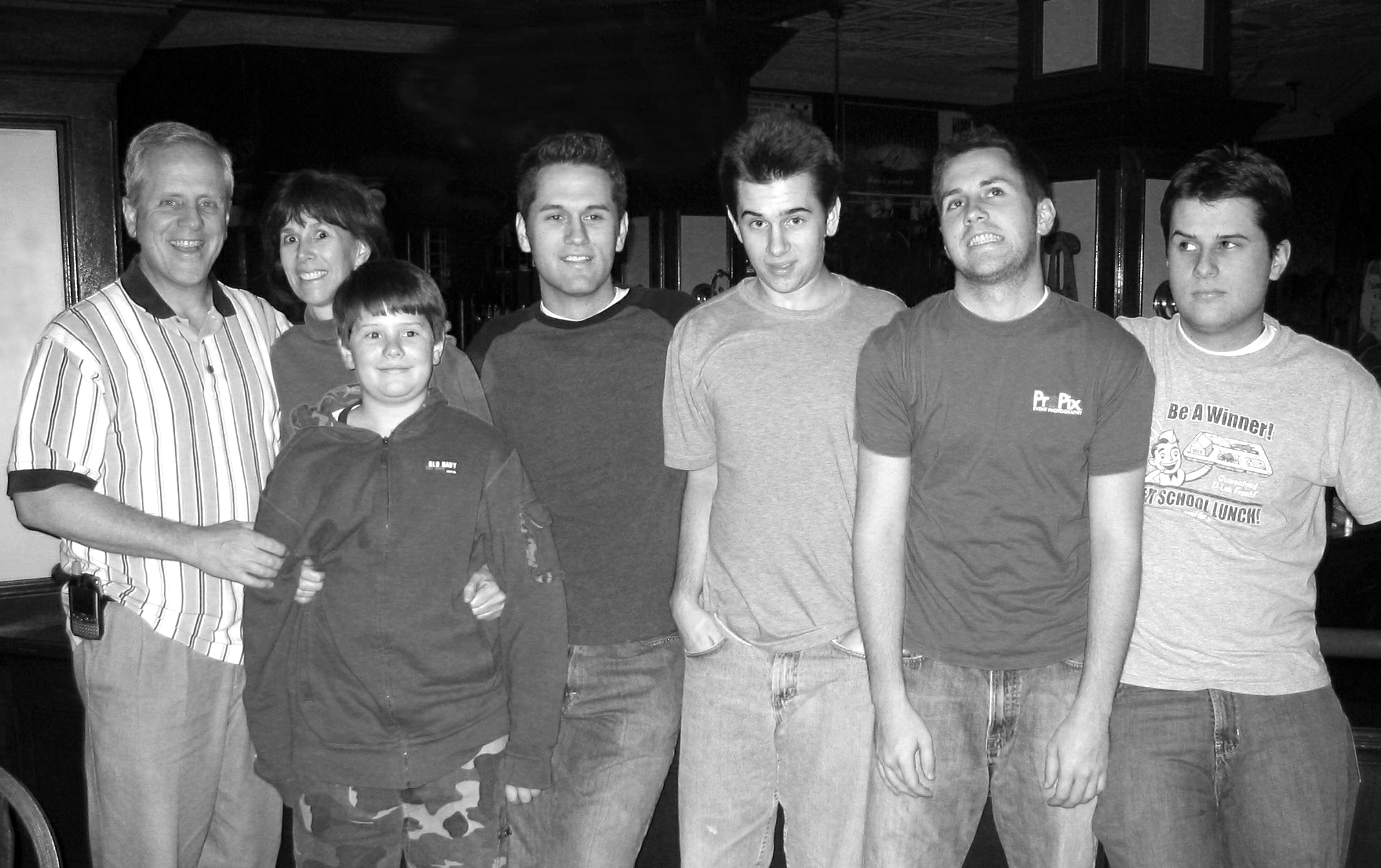 One of our favorite family portraits is hanging on our upstairs wall. It is a black and white version of a family “line-up” taken at a Marie Callenders restaurant many years ago. Recently, we found ourselves at the same restaurant in Southern California. We gathered all the players that were available and did our best to recreate the mood. I am thankful for fun family memories. Check out the two images below.